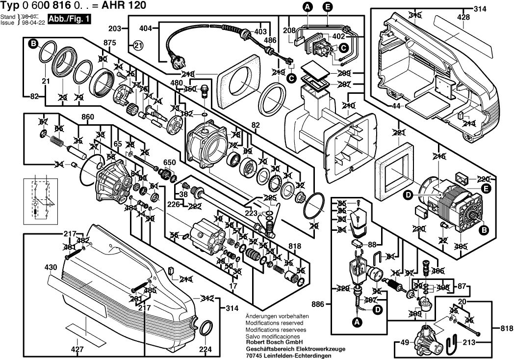 Vous trouverez ici toutes les pièces et dessins disponibles du 'Bosch 0600816003 ( AHR120 )'. De là, vous pouvez commander directement toutes les pièces souhaitées. De nombreuses pièces doivent être commandées auprès du fabricant, selon la marque, cela prend une à quatre semaines. Toutes les informations dont nous disposons se trouvent sur notre site Web, nous ne pouvons pas vous conseiller sur ce dont vous avez besoin, pour cela vous devrez retourner la machine pour réparation. Veuillez noter ce qui suit lors de la commande: