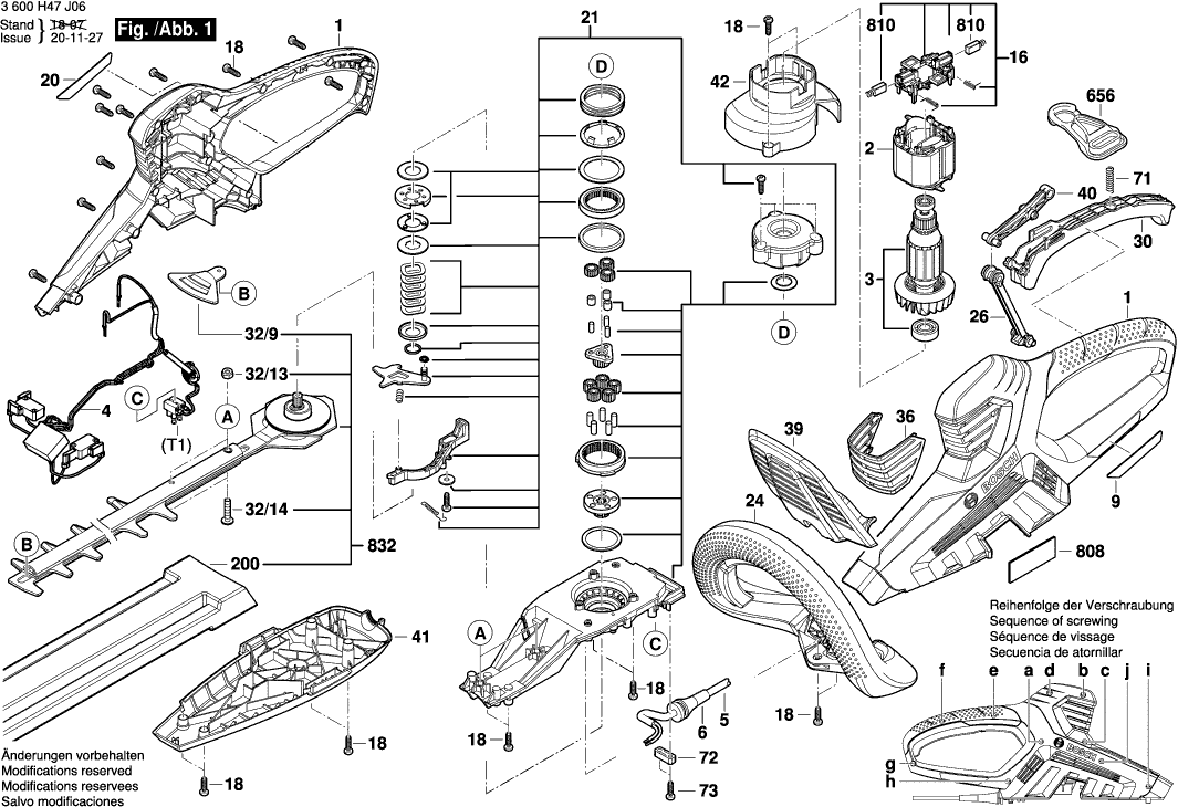Vous trouverez ici toutes les pièces et dessins disponibles du 'Bosch 3600H47J06 ( AHS65-34 )'. De là, vous pouvez commander directement toutes les pièces souhaitées. De nombreuses pièces doivent être commandées auprès du fabricant, selon la marque, cela prend une à quatre semaines. Toutes les informations dont nous disposons se trouvent sur notre site Web, nous ne pouvons pas vous conseiller sur ce dont vous avez besoin, pour cela vous devrez retourner la machine pour réparation. Veuillez noter ce qui suit lors de la commande: