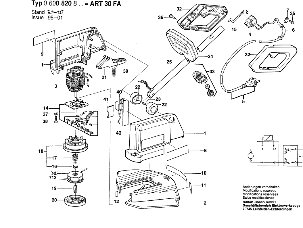 Vous trouverez ici toutes les pièces et dessins disponibles du 'Bosch 0600820836 ( ART30FA )'. De là, vous pouvez commander directement toutes les pièces souhaitées. De nombreuses pièces doivent être commandées auprès du fabricant, selon la marque, cela prend une à quatre semaines. Toutes les informations dont nous disposons se trouvent sur notre site Web, nous ne pouvons pas vous conseiller sur ce dont vous avez besoin, pour cela vous devrez retourner la machine pour réparation. Veuillez noter ce qui suit lors de la commande: