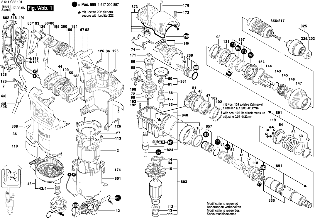 Vous trouverez ici toutes les pièces et dessins disponibles du 'Bosch 3611C32101 ( GBH4-32DFR )'. De là, vous pouvez commander directement toutes les pièces souhaitées. De nombreuses pièces doivent être commandées auprès du fabricant, selon la marque, cela prend une à quatre semaines. Toutes les informations dont nous disposons se trouvent sur notre site Web, nous ne pouvons pas vous conseiller sur ce dont vous avez besoin, pour cela vous devrez retourner la machine pour réparation. Veuillez noter ce qui suit lors de la commande: