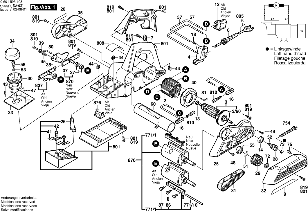 Vous trouverez ici toutes les pièces et dessins disponibles du 'Bosch 0601593168 ( GHO31-82 )'. De là, vous pouvez commander directement toutes les pièces souhaitées. De nombreuses pièces doivent être commandées auprès du fabricant, selon la marque, cela prend une à quatre semaines. Toutes les informations dont nous disposons se trouvent sur notre site Web, nous ne pouvons pas vous conseiller sur ce dont vous avez besoin, pour cela vous devrez retourner la machine pour réparation. Veuillez noter ce qui suit lors de la commande: