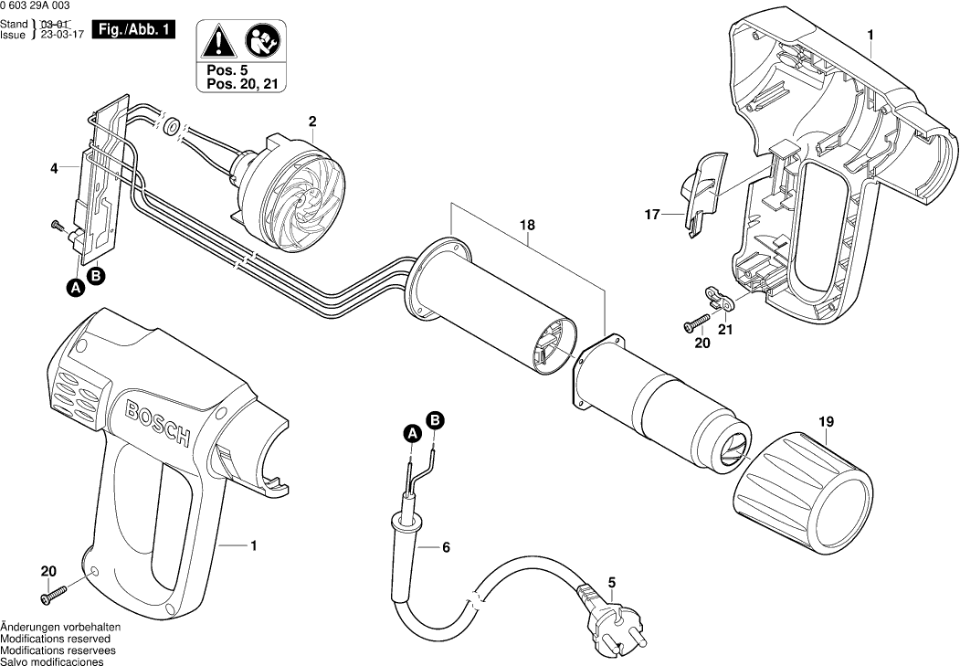 Vous trouverez ici toutes les pièces et dessins disponibles du 'Bosch 060329A003 ( PHG500-2 )'. De là, vous pouvez commander directement toutes les pièces souhaitées. De nombreuses pièces doivent être commandées auprès du fabricant, selon la marque, cela prend une à quatre semaines. Toutes les informations dont nous disposons se trouvent sur notre site Web, nous ne pouvons pas vous conseiller sur ce dont vous avez besoin, pour cela vous devrez retourner la machine pour réparation. Veuillez noter ce qui suit lors de la commande: