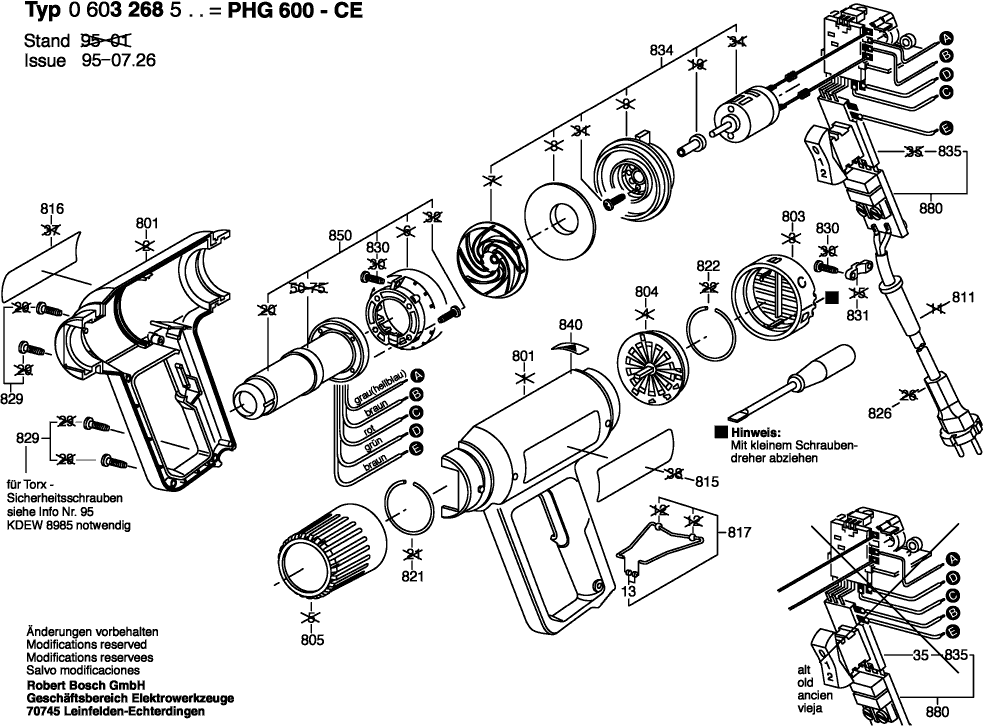 Vous trouverez ici toutes les pièces et dessins disponibles du 'Bosch 0603268503 ( PHG600CE )'. De là, vous pouvez commander directement toutes les pièces souhaitées. De nombreuses pièces doivent être commandées auprès du fabricant, selon la marque, cela prend une à quatre semaines. Toutes les informations dont nous disposons se trouvent sur notre site Web, nous ne pouvons pas vous conseiller sur ce dont vous avez besoin, pour cela vous devrez retourner la machine pour réparation. Veuillez noter ce qui suit lors de la commande: