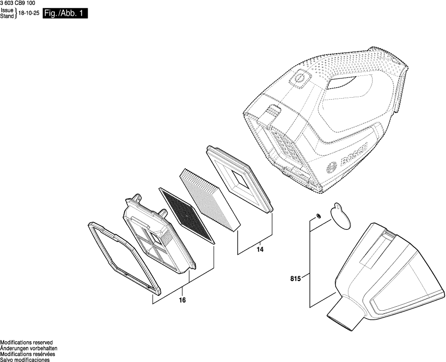 Vous trouverez ici toutes les pièces et dessins disponibles du 'Bosch 3603CB9100 ( UNIVERSALVAC18 )'. De là, vous pouvez commander directement toutes les pièces souhaitées. De nombreuses pièces doivent être commandées auprès du fabricant, selon la marque, cela prend une à quatre semaines. Toutes les informations dont nous disposons se trouvent sur notre site Web, nous ne pouvons pas vous conseiller sur ce dont vous avez besoin, pour cela vous devrez retourner la machine pour réparation. Veuillez noter ce qui suit lors de la commande:
