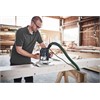 Het krachtpakket met enorme doortrekkracht. Zeer grote krachtsontplooiing en trekkracht bij hard materiaal en grote materiaalsterktes. Ergonomisch werken door de met 30° verstelde zijaanslag. Wissel van kopieerring en loopzool zonder gereedschap. Snelle comfort-freeswissel met kanteltoets en ratelprincipe. Snelle instelling van de profielfrees door in- en uitkoppelbare grondplaat. Meer precisie door extreme buigstijfheid dankzij dubbele geleidingsstatiefklem. Eenvoudige freesdiepte-instelling op de 1/10 mm exact. Tot 99 % afzuiging bij het kantenfrezen door afzinkbare afzuigring en spaanvanger. Toepassingen : Sponningen schaven, groeven maken en profileren. Uitfrezingen, cirkels en bogen frezen met de multifreessjabloon. Hoekverbindingen van werkplaten maken met de werkplaatssjabloon. Het frezen van groeven voor deurdichtingen en 3-puntsluitingen. Stationair frezen met de tafelfrees TF 2200 tot frezen Ø 60 mm.