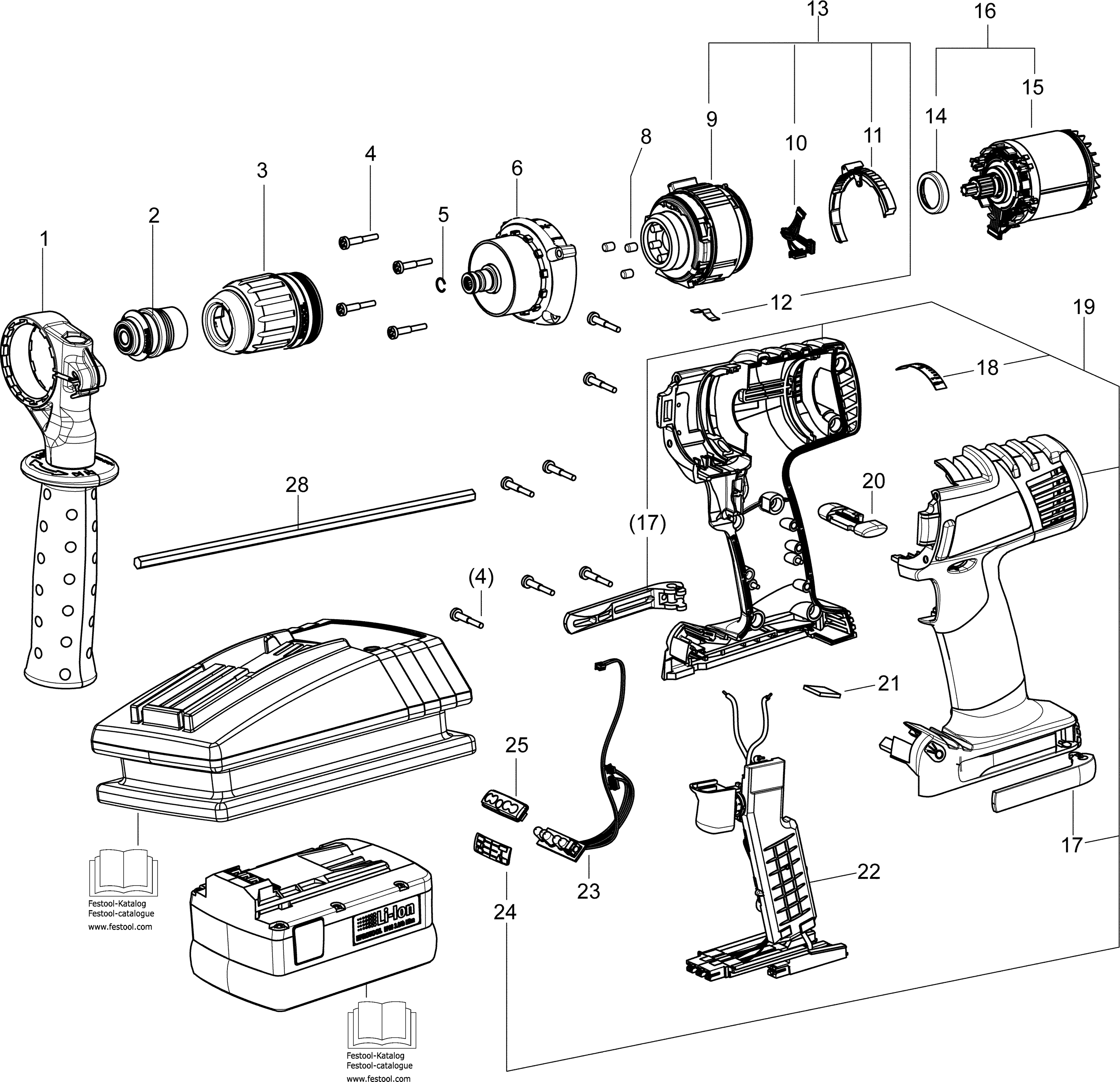 Vous trouverez ici toutes les pièces et dessins disponibles du 'Festool 768173 ( DRC18/4 )'. De là, vous pouvez commander directement toutes les pièces souhaitées. De nombreuses pièces doivent être commandées auprès du fabricant, selon la marque, cela prend une à quatre semaines. Toutes les informations dont nous disposons se trouvent sur notre site Web, nous ne pouvons pas vous conseiller sur ce dont vous avez besoin, pour cela vous devrez retourner la machine pour réparation. Veuillez noter ce qui suit lors de la commande: