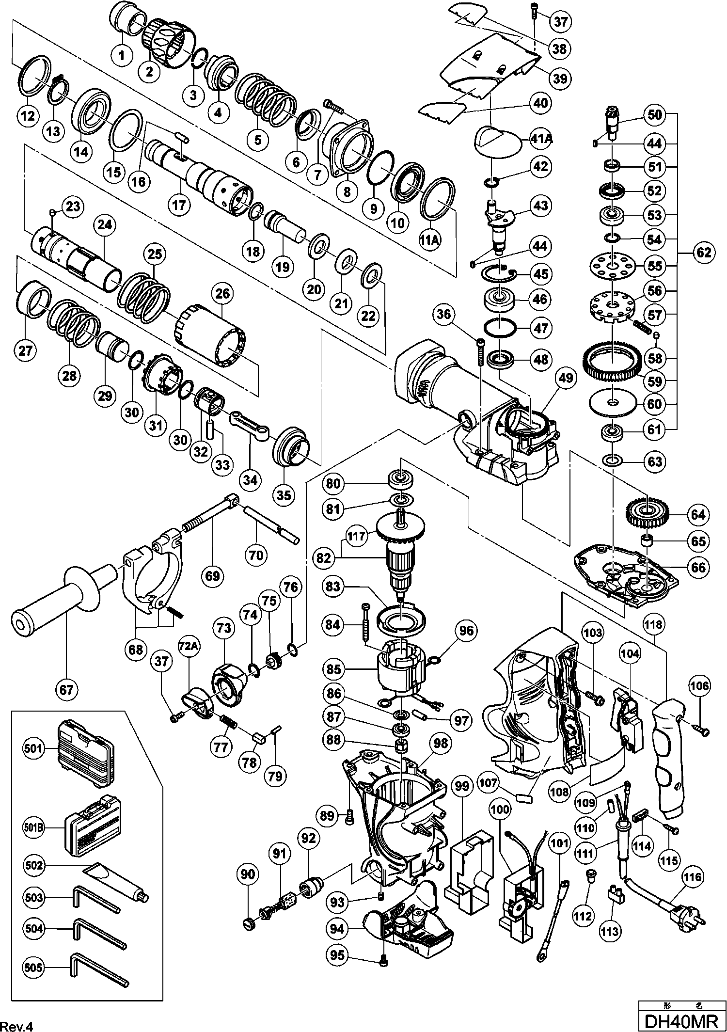 Vous trouverez ici toutes les pièces et dessins disponibles du 'Hikoki DH40MR'. De là, vous pouvez commander directement toutes les pièces souhaitées. De nombreuses pièces doivent être commandées auprès du fabricant, selon la marque, cela prend une à quatre semaines. Toutes les informations dont nous disposons se trouvent sur notre site Web, nous ne pouvons pas vous conseiller sur ce dont vous avez besoin, pour cela vous devrez retourner la machine pour réparation. Veuillez noter ce qui suit lors de la commande: