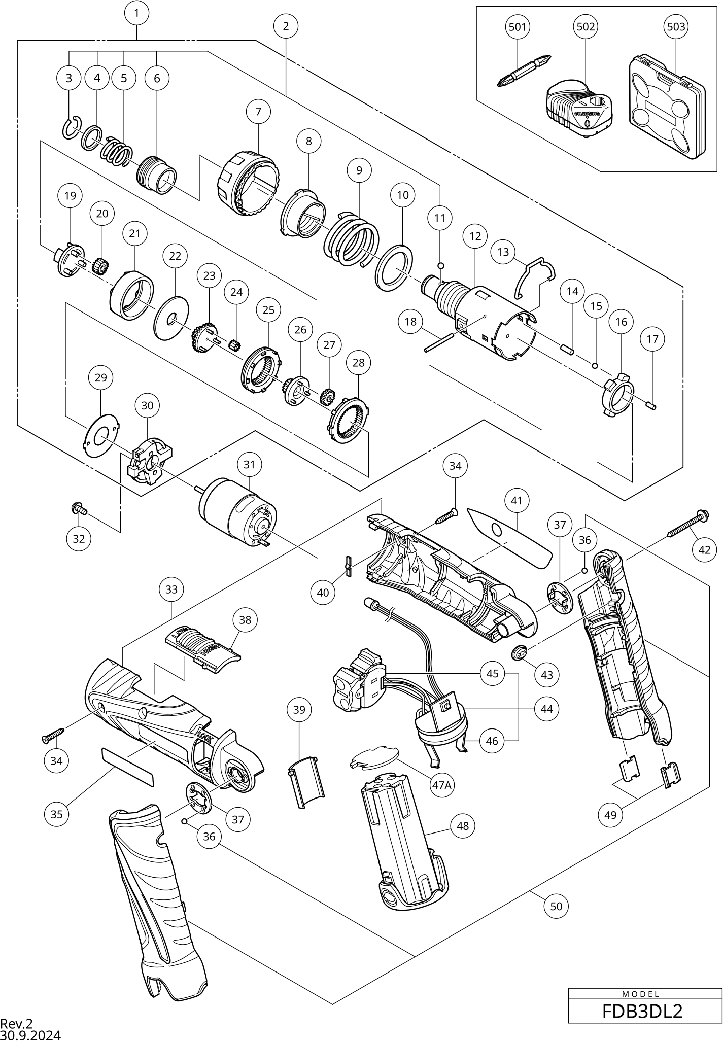 Vous trouverez ici toutes les pièces et dessins disponibles du 'Hikoki FDB3DL2'. De là, vous pouvez commander directement toutes les pièces souhaitées. De nombreuses pièces doivent être commandées auprès du fabricant, selon la marque, cela prend une à quatre semaines. Toutes les informations dont nous disposons se trouvent sur notre site Web, nous ne pouvons pas vous conseiller sur ce dont vous avez besoin, pour cela vous devrez retourner la machine pour réparation. Veuillez noter ce qui suit lors de la commande: