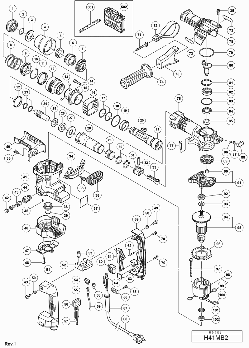 Vous trouverez ici toutes les pièces et dessins disponibles du 'Hikoki H41MB2WSZ'. De là, vous pouvez commander directement toutes les pièces souhaitées. De nombreuses pièces doivent être commandées auprès du fabricant, selon la marque, cela prend une à quatre semaines. Toutes les informations dont nous disposons se trouvent sur notre site Web, nous ne pouvons pas vous conseiller sur ce dont vous avez besoin, pour cela vous devrez retourner la machine pour réparation. Veuillez noter ce qui suit lors de la commande: