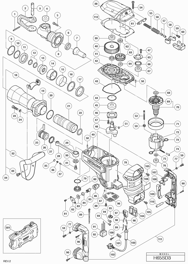 Vous trouverez ici toutes les pièces et dessins disponibles du 'Hikoki H65SD3'. De là, vous pouvez commander directement toutes les pièces souhaitées. De nombreuses pièces doivent être commandées auprès du fabricant, selon la marque, cela prend une à quatre semaines. Toutes les informations dont nous disposons se trouvent sur notre site Web, nous ne pouvons pas vous conseiller sur ce dont vous avez besoin, pour cela vous devrez retourner la machine pour réparation. Veuillez noter ce qui suit lors de la commande: