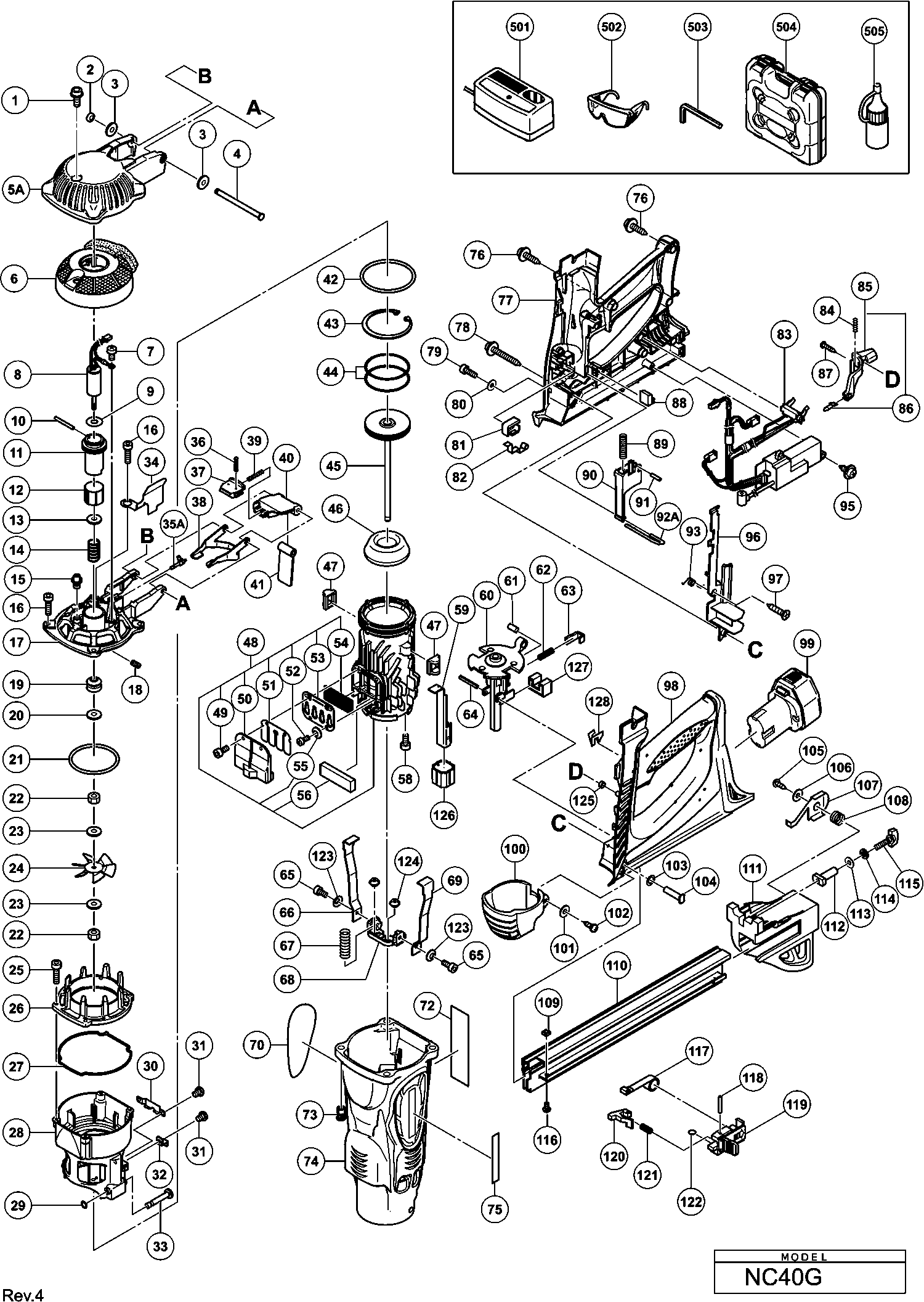 Vous trouverez ici toutes les pièces et dessins disponibles du 'Hikoki NC40G'. De là, vous pouvez commander directement toutes les pièces souhaitées. De nombreuses pièces doivent être commandées auprès du fabricant, selon la marque, cela prend une à quatre semaines. Toutes les informations dont nous disposons se trouvent sur notre site Web, nous ne pouvons pas vous conseiller sur ce dont vous avez besoin, pour cela vous devrez retourner la machine pour réparation. Veuillez noter ce qui suit lors de la commande: