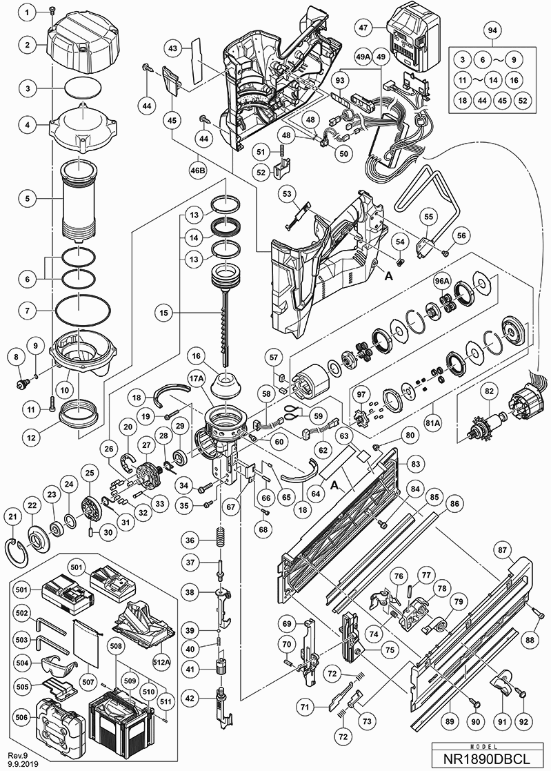 Vous trouverez ici toutes les pièces et dessins disponibles du 'Hikoki NR1890DBCLW9Z'. De là, vous pouvez commander directement toutes les pièces souhaitées. De nombreuses pièces doivent être commandées auprès du fabricant, selon la marque, cela prend une à quatre semaines. Toutes les informations dont nous disposons se trouvent sur notre site Web, nous ne pouvons pas vous conseiller sur ce dont vous avez besoin, pour cela vous devrez retourner la machine pour réparation. Veuillez noter ce qui suit lors de la commande: