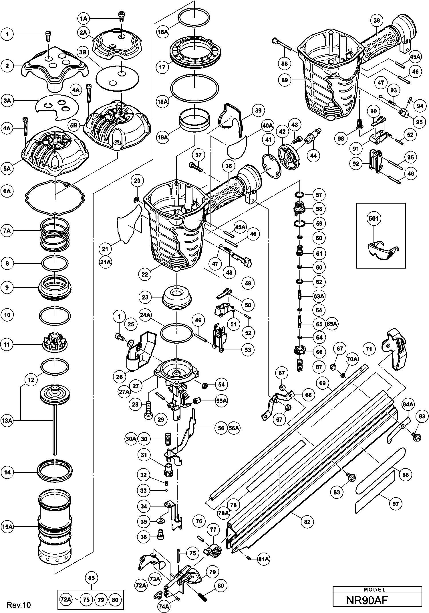 Vous trouverez ici toutes les pièces et dessins disponibles du 'Hikoki NR90AF'. De là, vous pouvez commander directement toutes les pièces souhaitées. De nombreuses pièces doivent être commandées auprès du fabricant, selon la marque, cela prend une à quatre semaines. Toutes les informations dont nous disposons se trouvent sur notre site Web, nous ne pouvons pas vous conseiller sur ce dont vous avez besoin, pour cela vous devrez retourner la machine pour réparation. Veuillez noter ce qui suit lors de la commande: