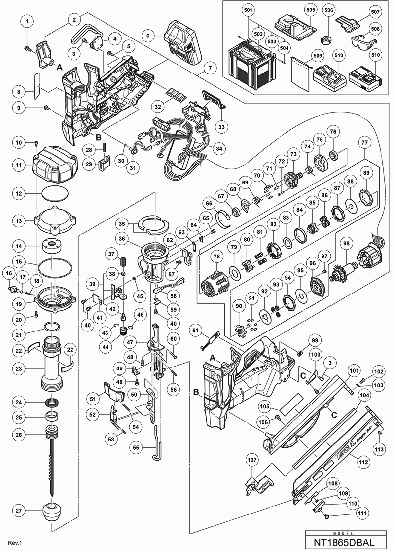 Vous trouverez ici toutes les pièces et dessins disponibles du 'Hikoki NT1865DBAL'. De là, vous pouvez commander directement toutes les pièces souhaitées. De nombreuses pièces doivent être commandées auprès du fabricant, selon la marque, cela prend une à quatre semaines. Toutes les informations dont nous disposons se trouvent sur notre site Web, nous ne pouvons pas vous conseiller sur ce dont vous avez besoin, pour cela vous devrez retourner la machine pour réparation. Veuillez noter ce qui suit lors de la commande: