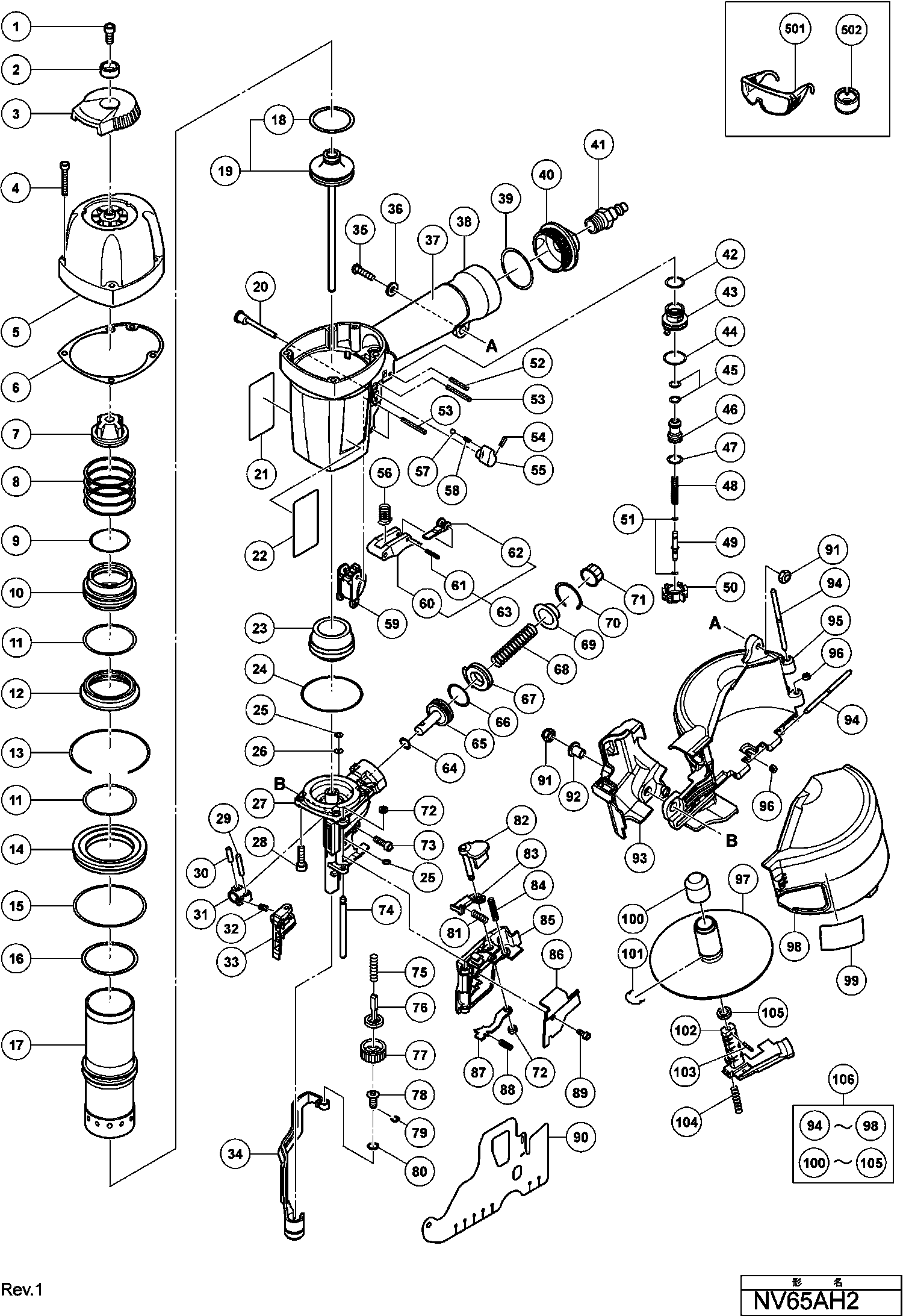 Vous trouverez ici toutes les pièces et dessins disponibles du 'Hikoki NV65AH2'. De là, vous pouvez commander directement toutes les pièces souhaitées. De nombreuses pièces doivent être commandées auprès du fabricant, selon la marque, cela prend une à quatre semaines. Toutes les informations dont nous disposons se trouvent sur notre site Web, nous ne pouvons pas vous conseiller sur ce dont vous avez besoin, pour cela vous devrez retourner la machine pour réparation. Veuillez noter ce qui suit lors de la commande: