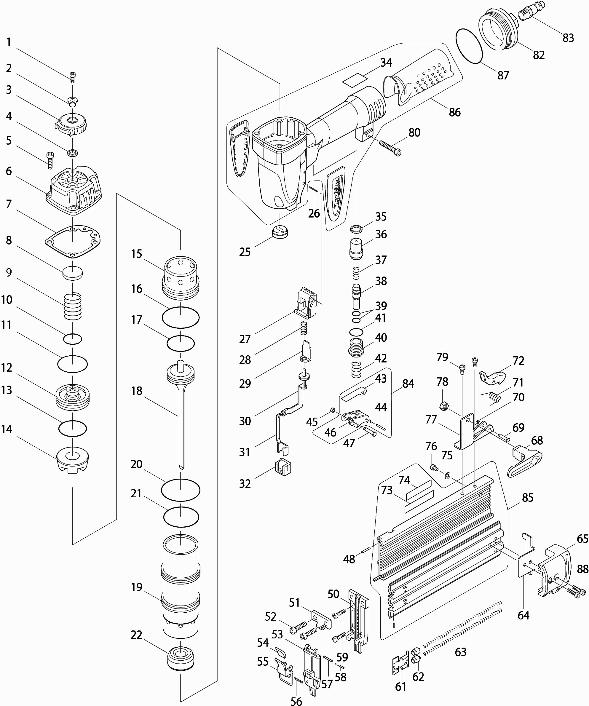 Vous trouverez ici toutes les pièces et dessins disponibles du 'Makita AF505'. De là, vous pouvez commander directement toutes les pièces souhaitées. De nombreuses pièces doivent être commandées auprès du fabricant, selon la marque, cela prend une à quatre semaines. Toutes les informations dont nous disposons se trouvent sur notre site Web, nous ne pouvons pas vous conseiller sur ce dont vous avez besoin, pour cela vous devrez retourner la machine pour réparation. Veuillez noter ce qui suit lors de la commande: