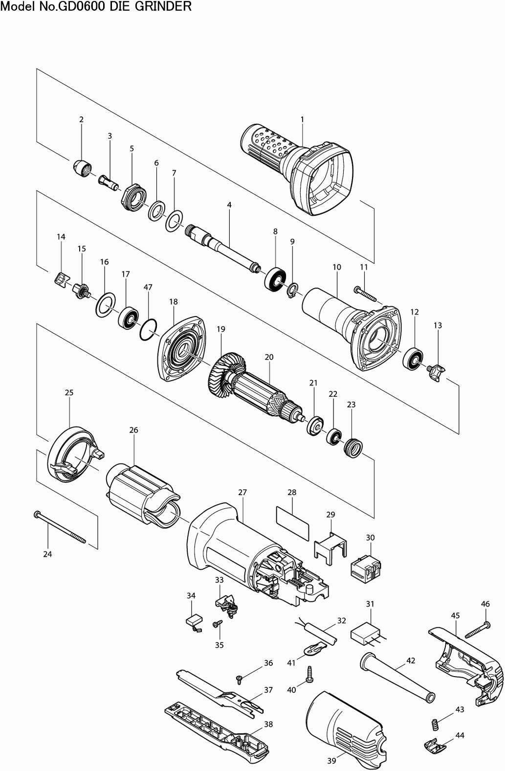 Vous trouverez ici toutes les pièces et dessins disponibles du 'Makita GD0600'. De là, vous pouvez commander directement toutes les pièces souhaitées. De nombreuses pièces doivent être commandées auprès du fabricant, selon la marque, cela prend une à quatre semaines. Toutes les informations dont nous disposons se trouvent sur notre site Web, nous ne pouvons pas vous conseiller sur ce dont vous avez besoin, pour cela vous devrez retourner la machine pour réparation. Veuillez noter ce qui suit lors de la commande: