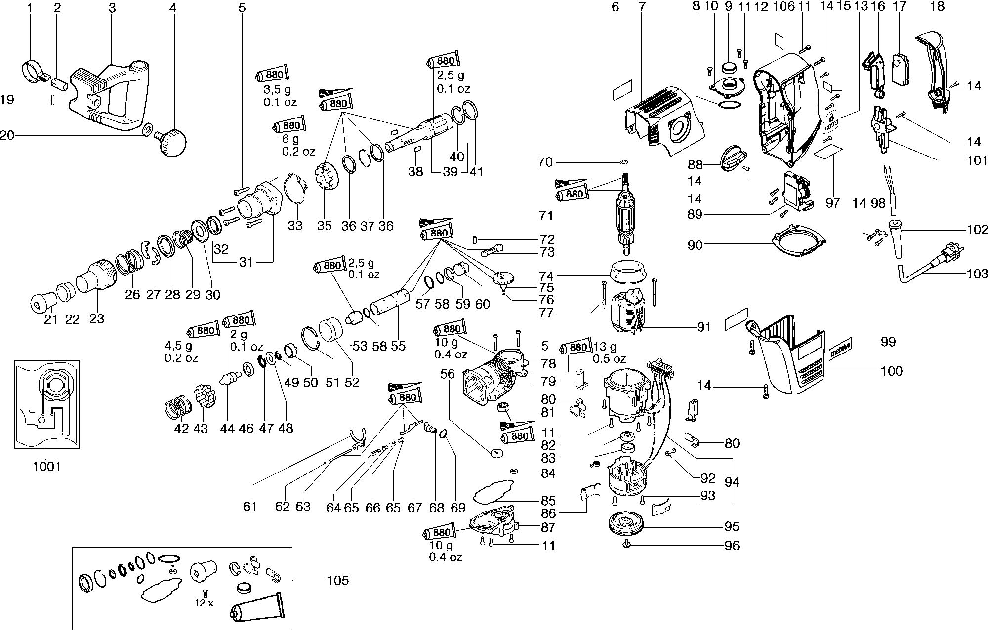 Vous trouverez ici toutes les pièces et dessins disponibles du 'Metabo 00265000 ( MHE65 )'. De là, vous pouvez commander directement toutes les pièces souhaitées. De nombreuses pièces doivent être commandées auprès du fabricant, selon la marque, cela prend une à quatre semaines. Toutes les informations dont nous disposons se trouvent sur notre site Web, nous ne pouvons pas vous conseiller sur ce dont vous avez besoin, pour cela vous devrez retourner la machine pour réparation. Veuillez noter ce qui suit lors de la commande: