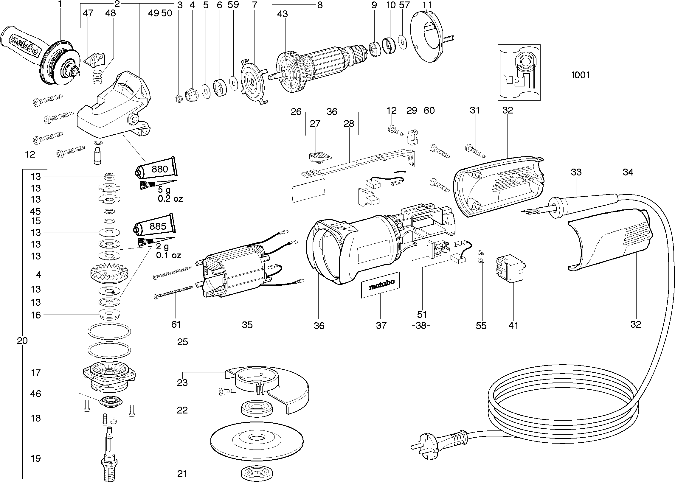 Vous trouverez ici toutes les pièces et dessins disponibles du 'Metabo 20035011 ( WQ1000 )'. De là, vous pouvez commander directement toutes les pièces souhaitées. De nombreuses pièces doivent être commandées auprès du fabricant, selon la marque, cela prend une à quatre semaines. Toutes les informations dont nous disposons se trouvent sur notre site Web, nous ne pouvons pas vous conseiller sur ce dont vous avez besoin, pour cela vous devrez retourner la machine pour réparation. Veuillez noter ce qui suit lors de la commande: