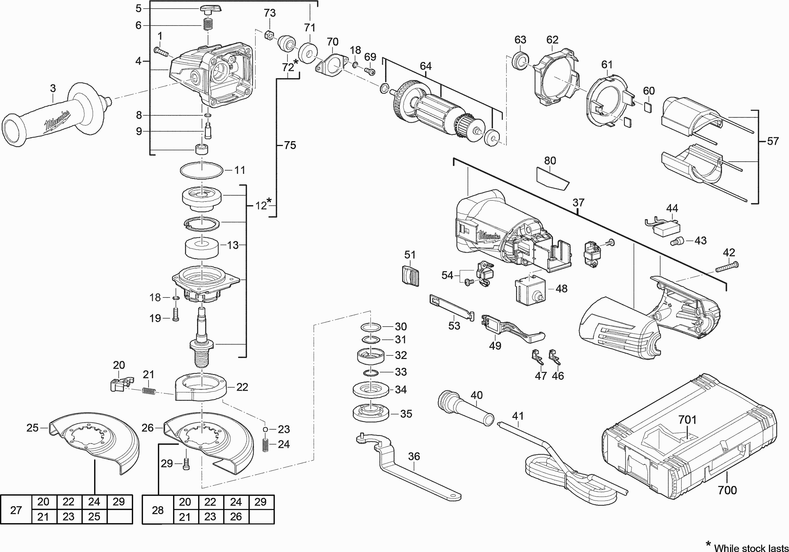 Vous trouverez ici toutes les pièces et dessins disponibles du 'Milwaukee 4000428078 ( AG12-125X )'. De là, vous pouvez commander directement toutes les pièces souhaitées. De nombreuses pièces doivent être commandées auprès du fabricant, selon la marque, cela prend une à quatre semaines. Toutes les informations dont nous disposons se trouvent sur notre site Web, nous ne pouvons pas vous conseiller sur ce dont vous avez besoin, pour cela vous devrez retourner la machine pour réparation. Veuillez noter ce qui suit lors de la commande: