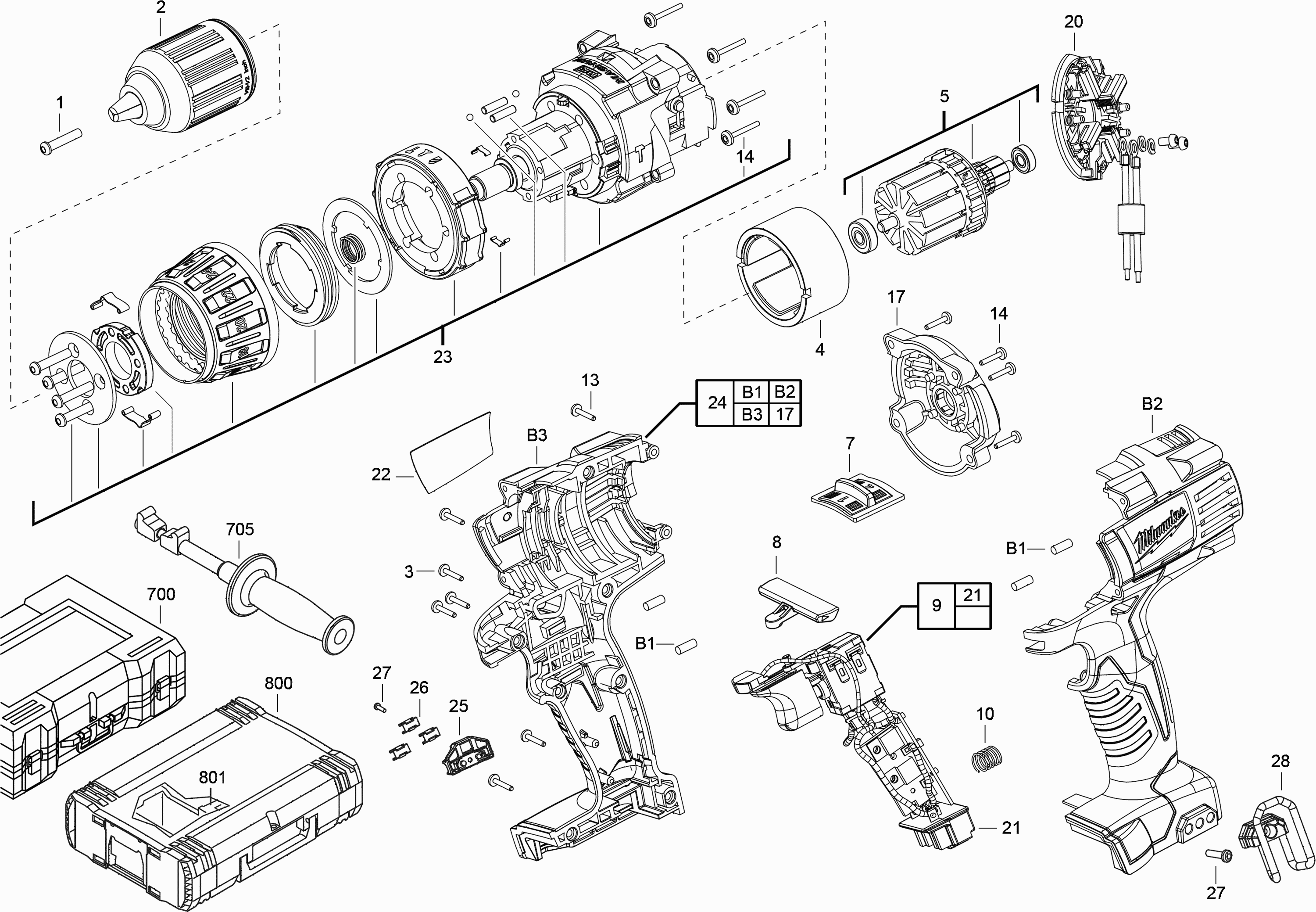Vous trouverez ici toutes les pièces et dessins disponibles du 'Milwaukee 4000447209 ( HD18PD-0 )'. De là, vous pouvez commander directement toutes les pièces souhaitées. De nombreuses pièces doivent être commandées auprès du fabricant, selon la marque, cela prend une à quatre semaines. Toutes les informations dont nous disposons se trouvent sur notre site Web, nous ne pouvons pas vous conseiller sur ce dont vous avez besoin, pour cela vous devrez retourner la machine pour réparation. Veuillez noter ce qui suit lors de la commande: