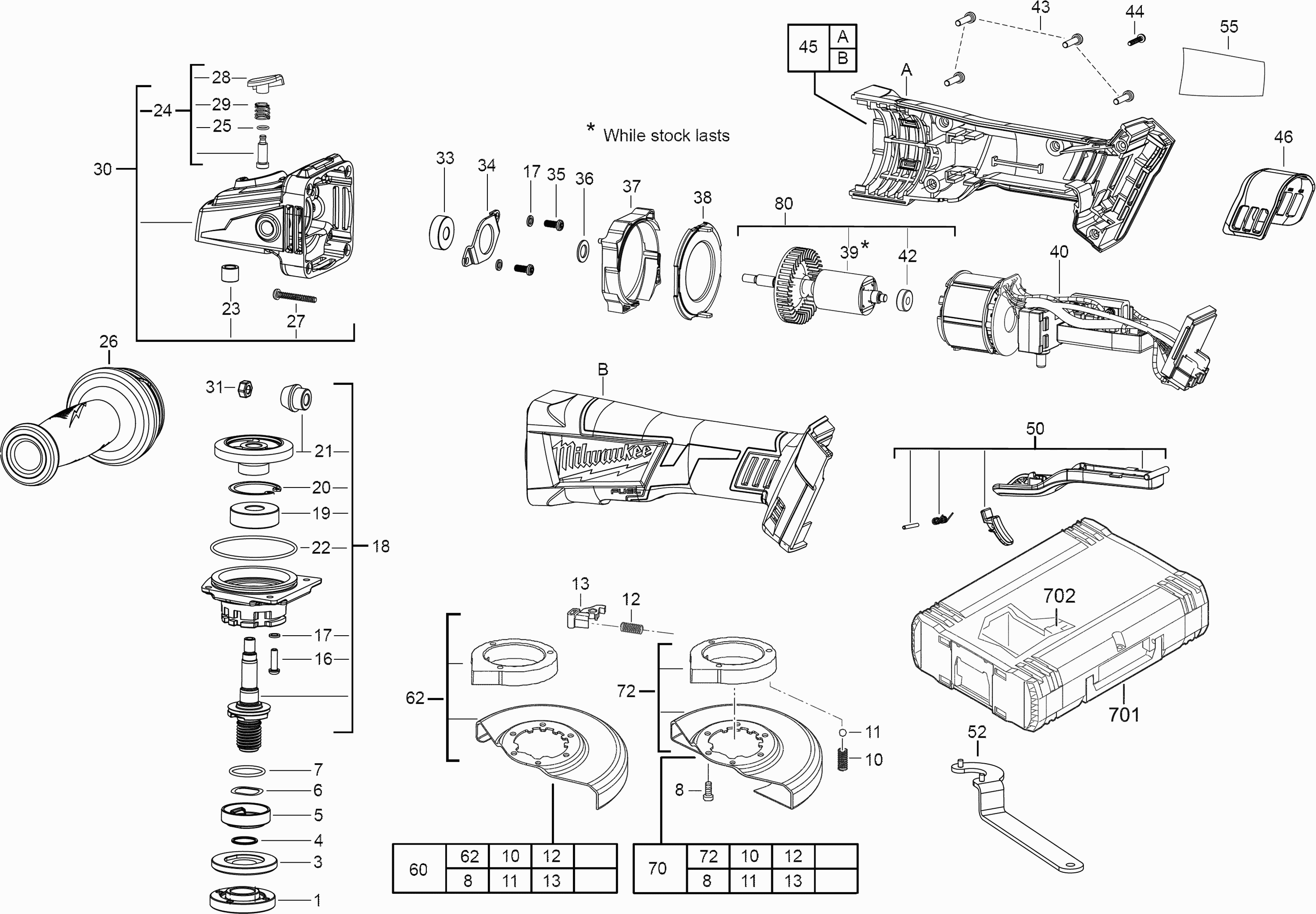 Vous trouverez ici toutes les pièces et dessins disponibles du 'Milwaukee 4000458512 ( M18CAG125XPD-0 )'. De là, vous pouvez commander directement toutes les pièces souhaitées. De nombreuses pièces doivent être commandées auprès du fabricant, selon la marque, cela prend une à quatre semaines. Toutes les informations dont nous disposons se trouvent sur notre site Web, nous ne pouvons pas vous conseiller sur ce dont vous avez besoin, pour cela vous devrez retourner la machine pour réparation. Veuillez noter ce qui suit lors de la commande: