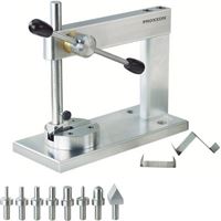 MICRO-press MP120. Bedoeld voor drukken, uklinken, stampen, het buigen van de draden en plaatwerk. Bedoeld voor zacht taaie materialen. Met 5 cilindrische stempels (verharding) die bevestigd zijn door de kartelschroef in het rek: Ø 3 - 4 - 5 - 6 en 8 mm. Eenvoudig regelbare, geharde plaat pers met alle noodzakelijke boringen en matrices voor de bovengenoemde maten.